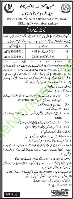 - Submission: Complete applications along with required documents should be sent via courier to the Director Human Resources, SMBB Medical University, Moen-jo-Daro (Arija) Road, Larkana.