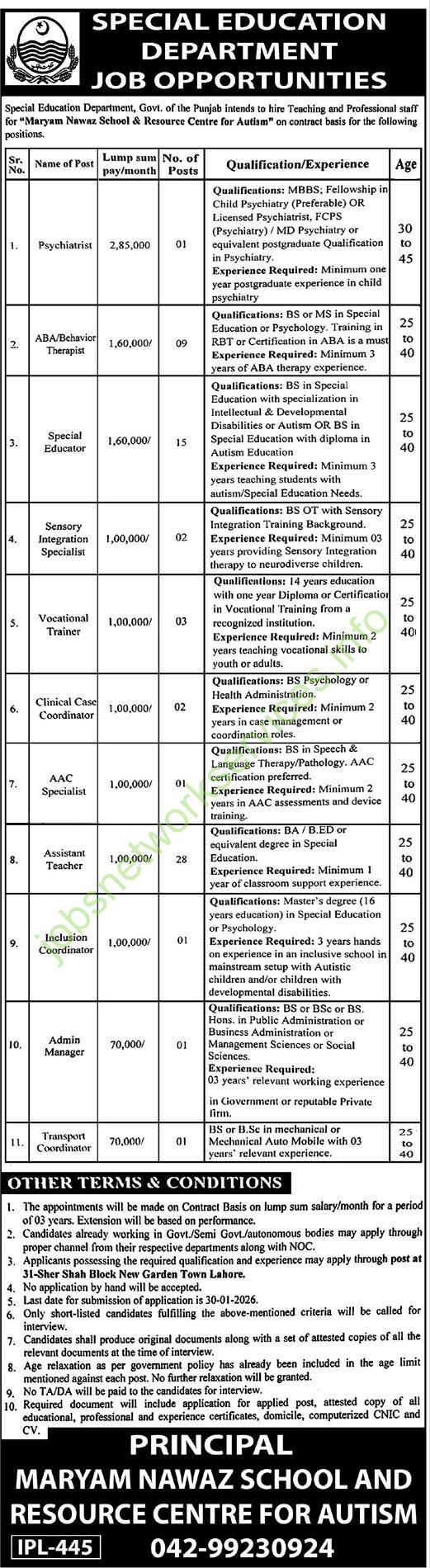 Here is a structured summary of the job advertisement from the Special Education Department, Punjab: