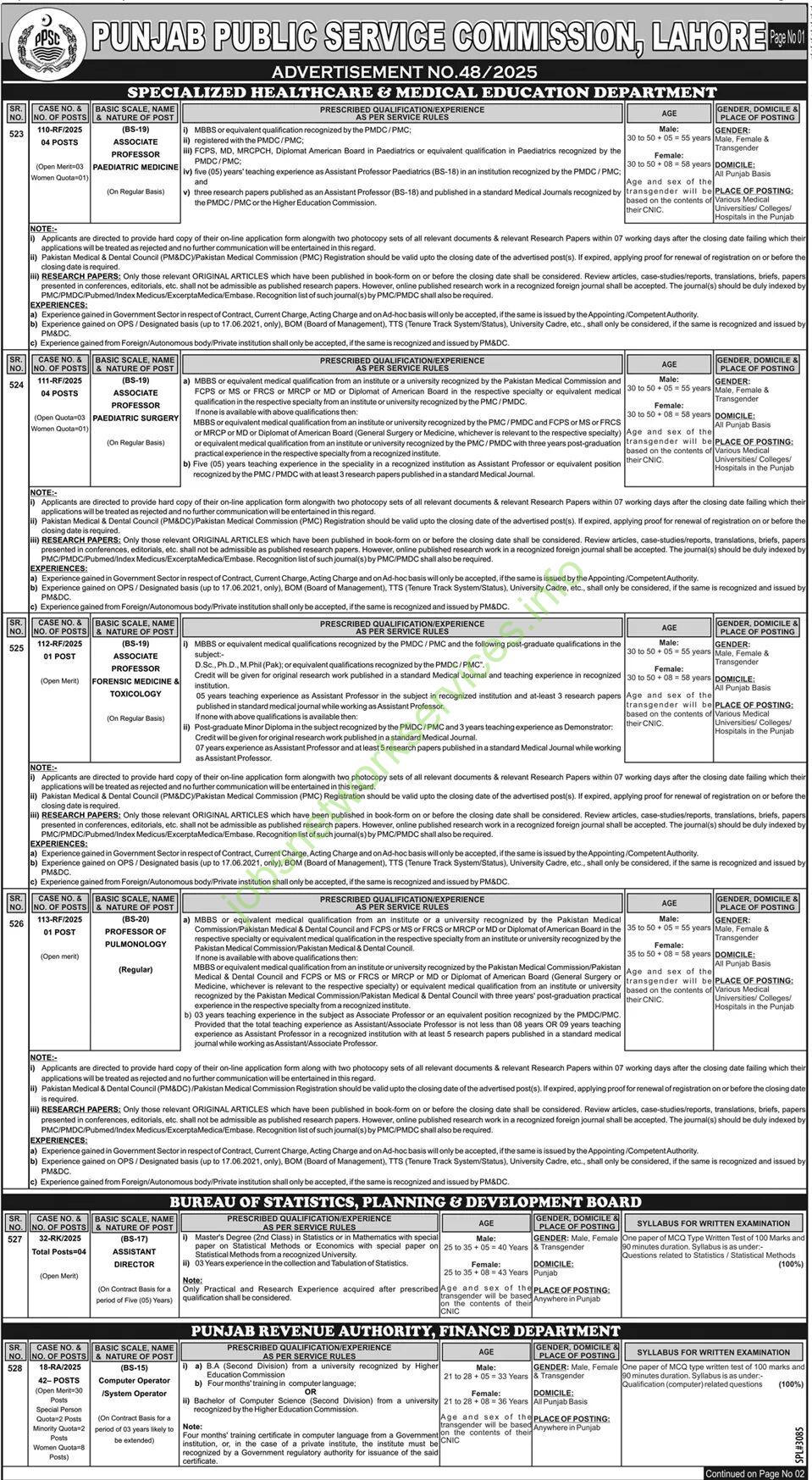 | 525 | Associate Professor of Forensic Medicine & Toxicology | BS-19 | Nawaz Sharif Medical College, Gujrat | MBBS + PMC recognized PG in Forensic Medicine | 7 years as Assistant Professor | 30–50 (+5) | 5 research papers (2 as Asst. Prof) |