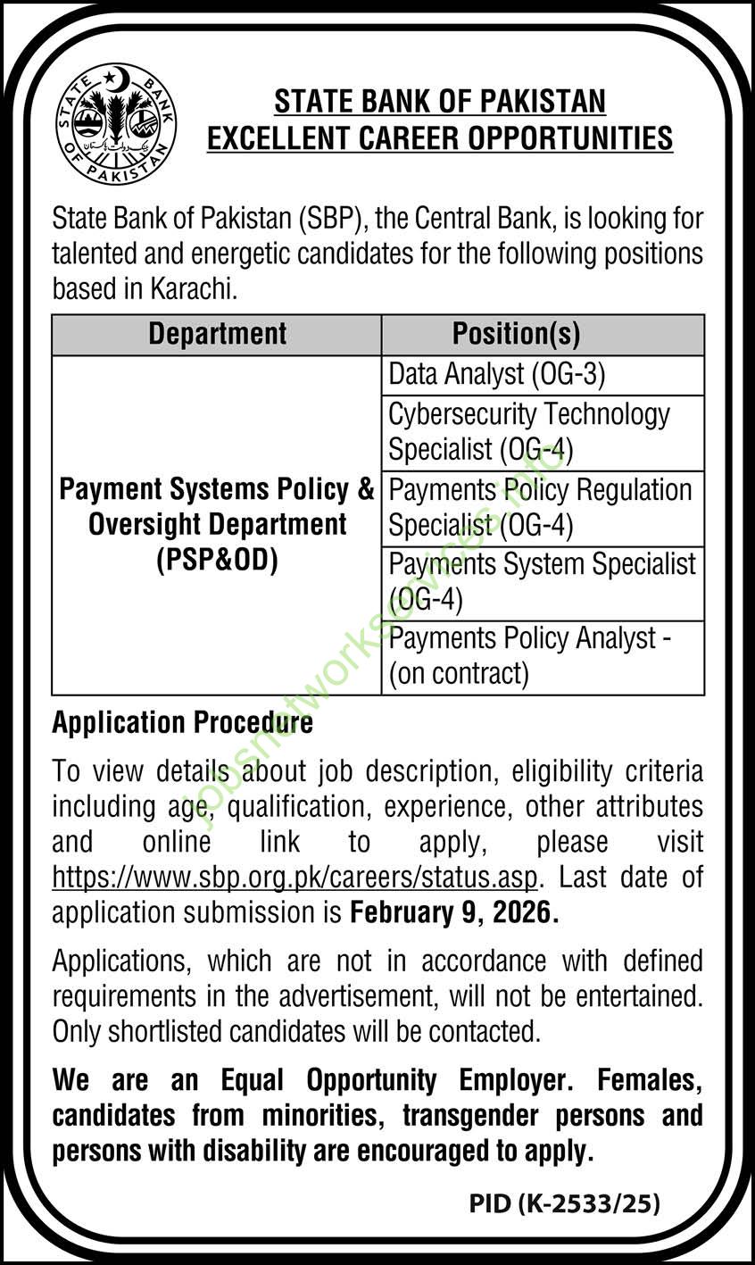 State Bank of Pakistan (SBP), the Central Bank, is seeking talented and energetic candidates for the following positions based in Karachi.