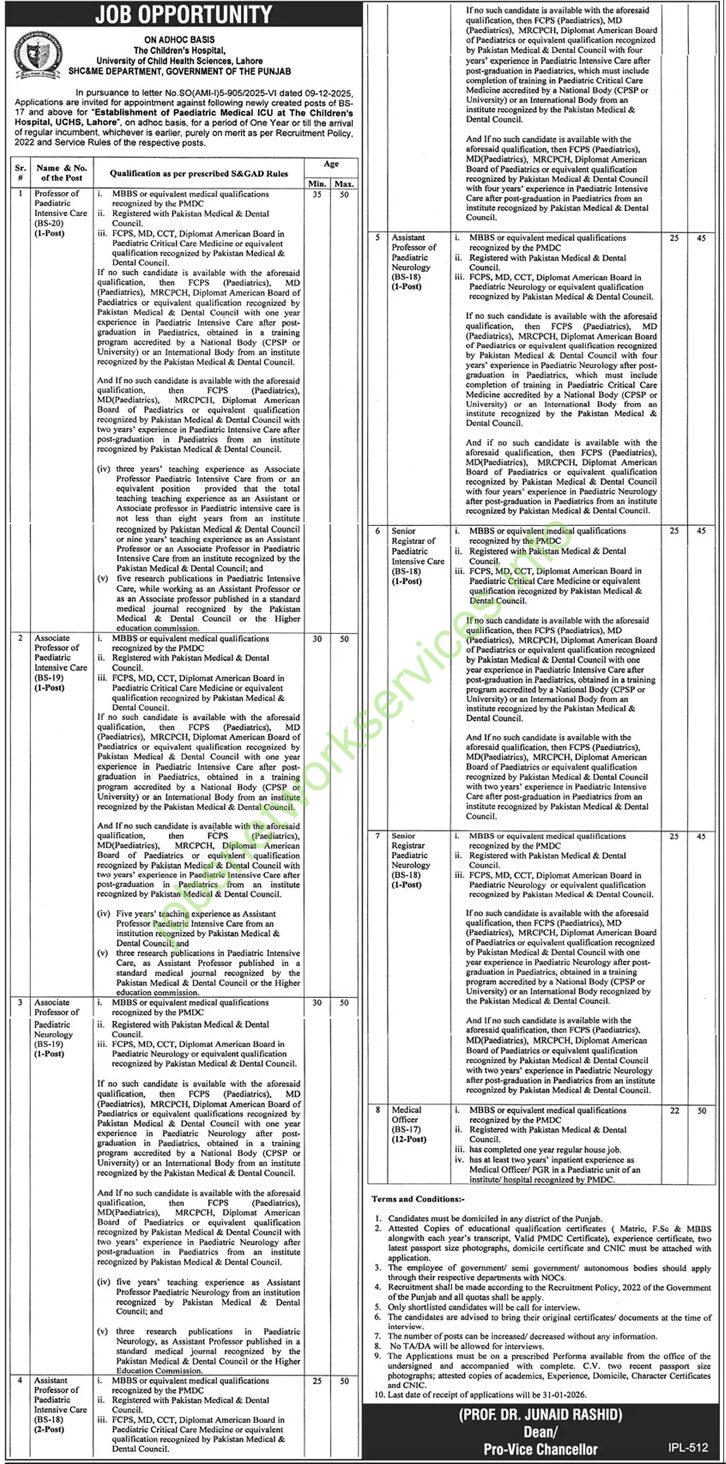 The Children’s Hospital University of Child Health Sciences Lahore Jobs 2026 Latest