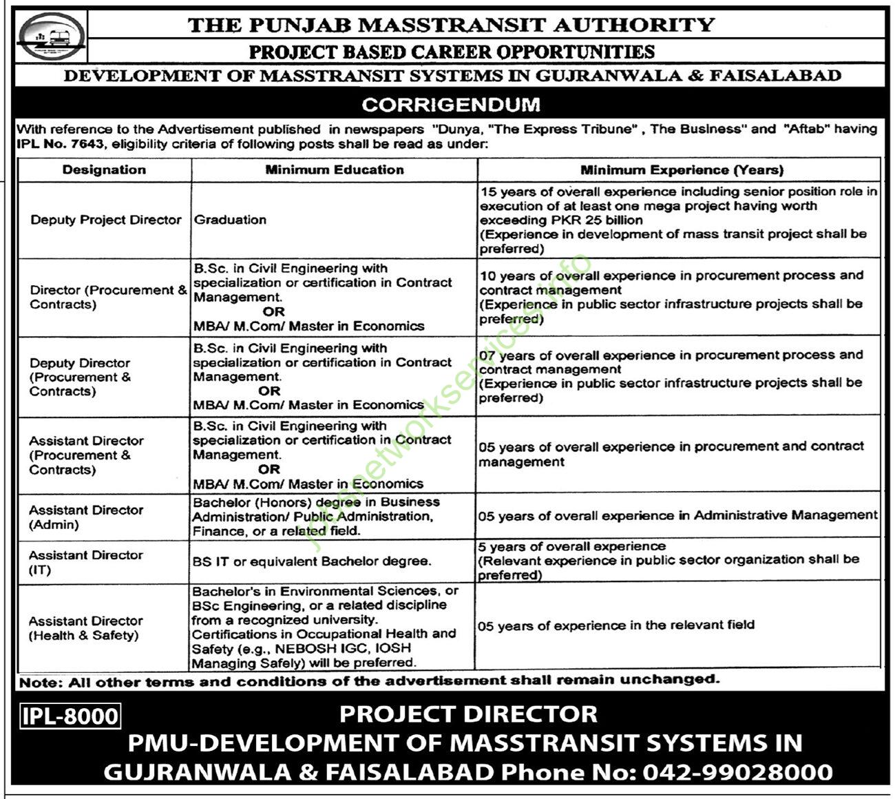 This document is a corrigendum (an official correction notice) issued by The Punjab Masstransit Authority for its project-based job advertisement.
