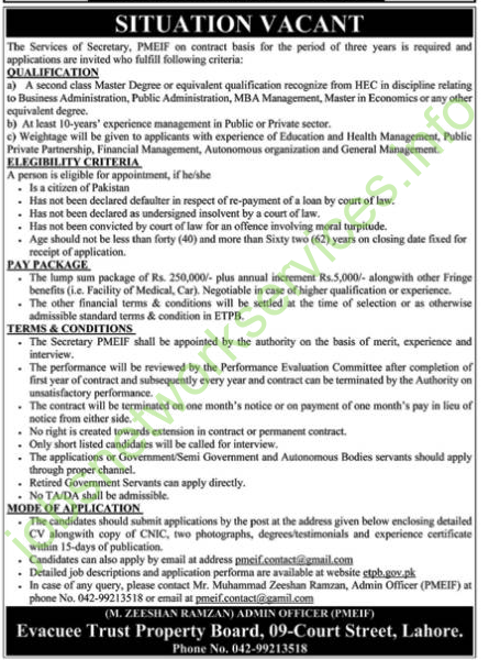The Services of Secretary, PMEIF on contract basis for the period of three years is required and applications are invited who fulfill following criteria: