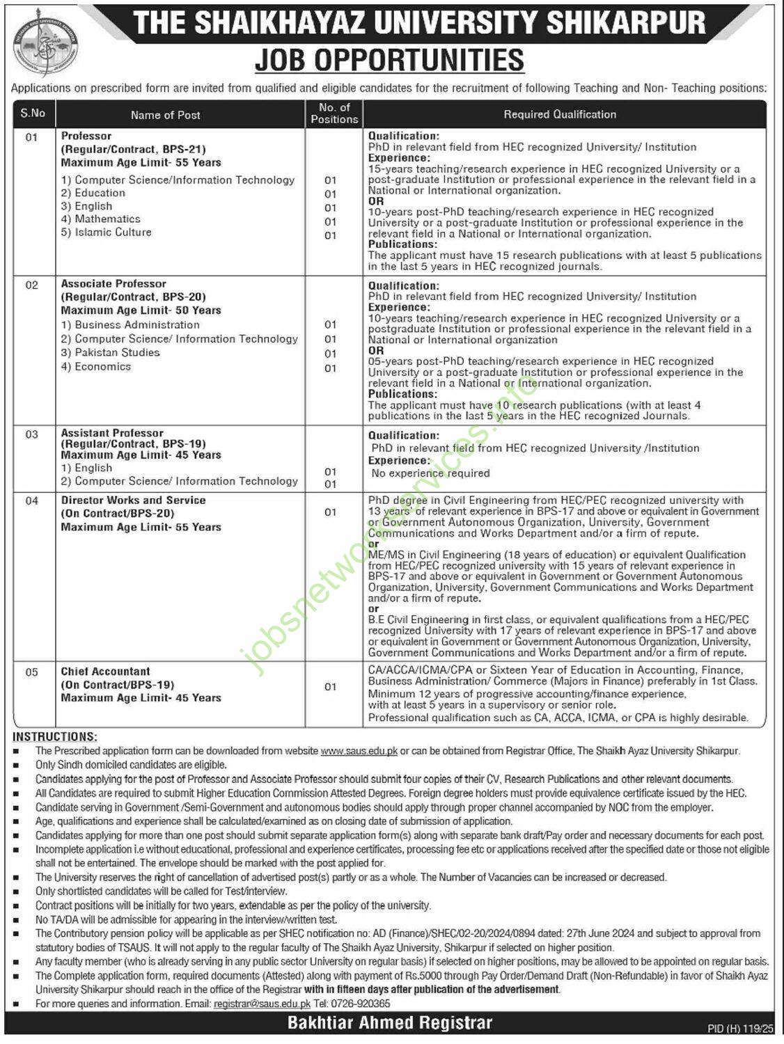 Job advertisement from The Shaikh Ayaz University Shikarpur.