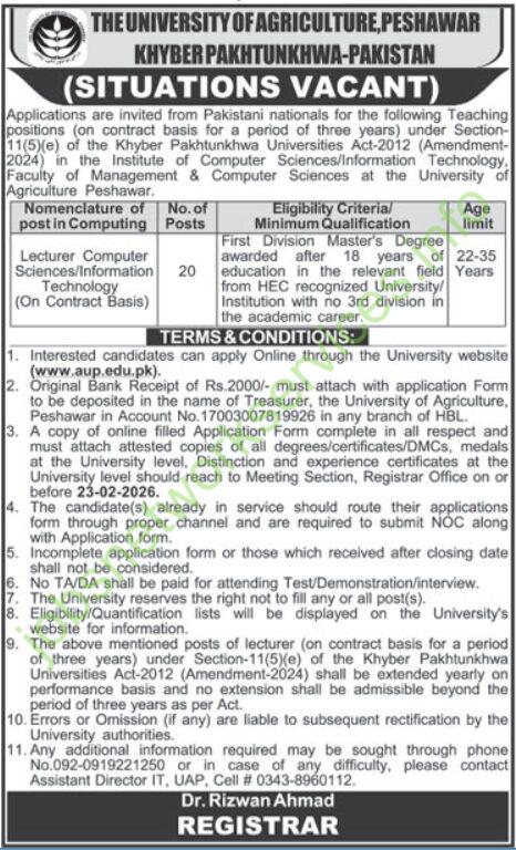 Applications are invited from Pakistani nationals for the following Teaching positions (on contract basis for a period of three years) under Section 11(5)(e) of the Khyber Pakhtunkhwa Universities Act-2012 (Amendment-2024) in the Institute of Computer Sciences/Information Technology, Faculty of Management & Computer Sciences at the University of Agriculture Peshawar.