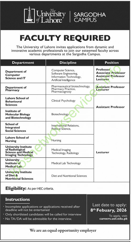 This is a recruitment notice from The University of Lahore (UOL) for faculty positions at its Sargodha Campus for the year 2026.