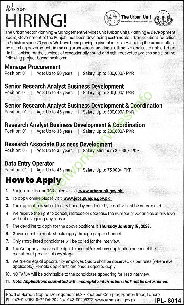 This is a job advertisement for The Urban Unit (Urban Sector Planning & Management Services Unit) under the Planning & Development Board, Government of Punjab, Pakistan.