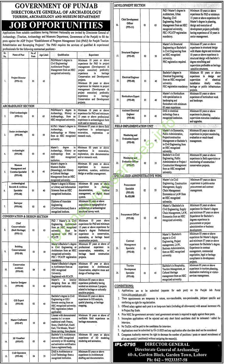 - Chief Conservationist (Built Heritage) (PPS-11):01 Post – Requires PhD/Master’s in Civil Engineering/Architecture with PEC/PCATP registration and 10-15+ years of conservation experience.