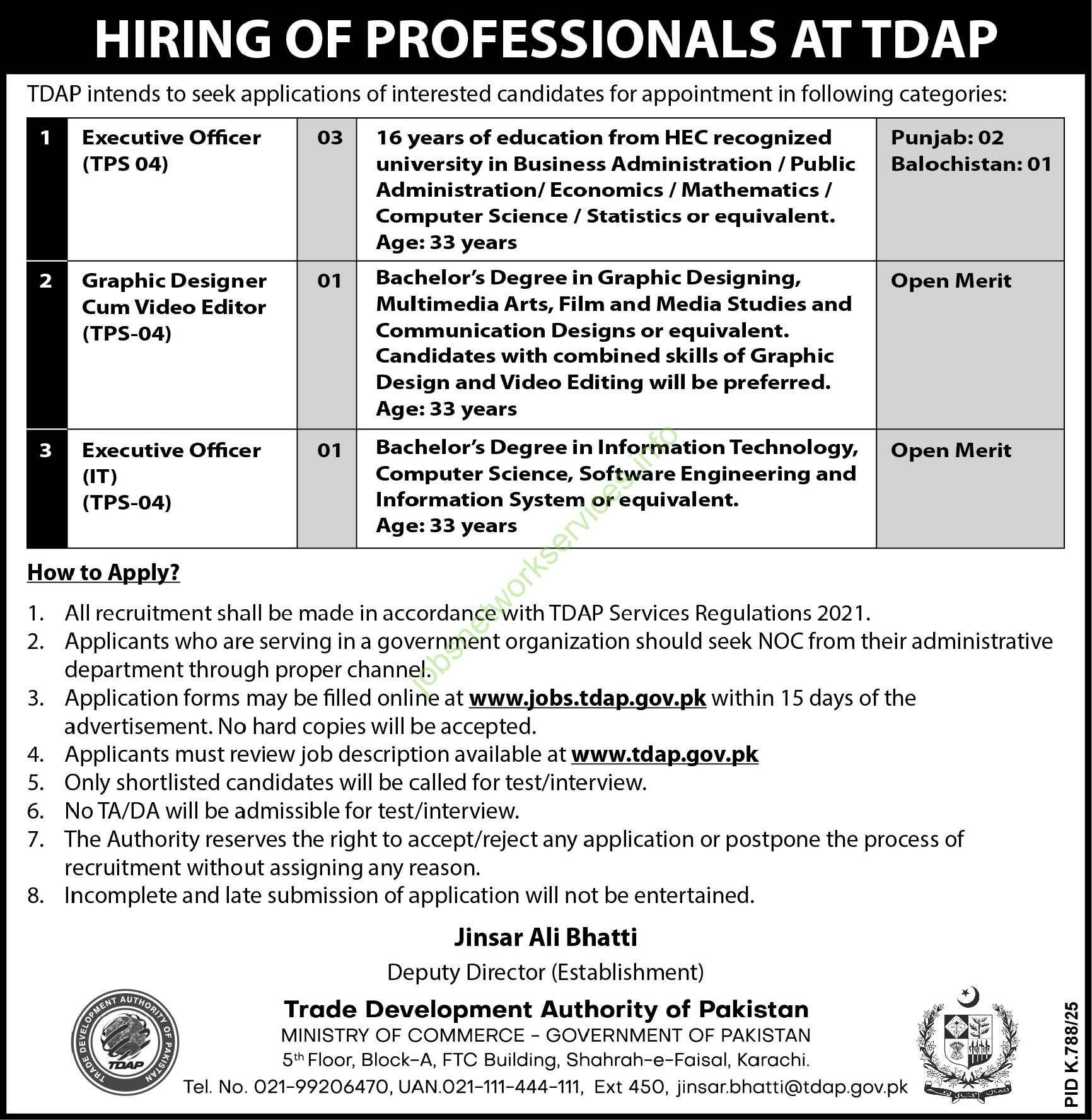 The Trade Development Authority of Pakistan (TDAP) is hiring professionals for multiple positions on a contract basis. Here are the key details: