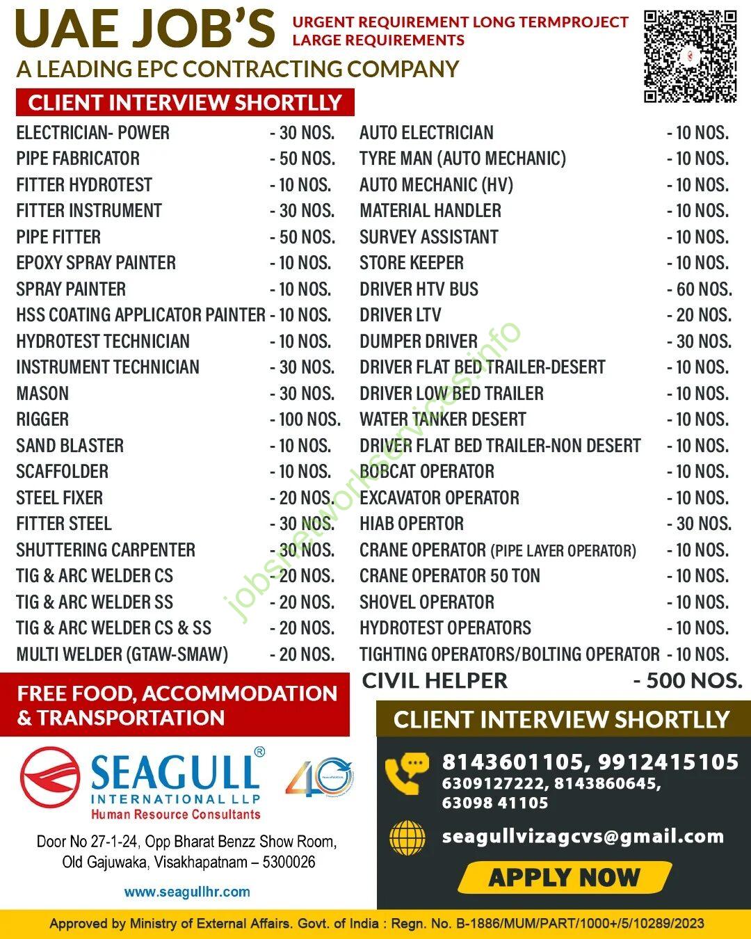 This flyer outlines an urgent recruitment drive for a long-term project in the UAE with a leading EPC Contracting Company. The hiring is being managed by Seagull International LLP.