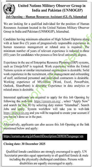 Human Resources Assistant position with UNMOGIP in Islamabad. The user seems to want me to extract and organize the key details from this job posting.