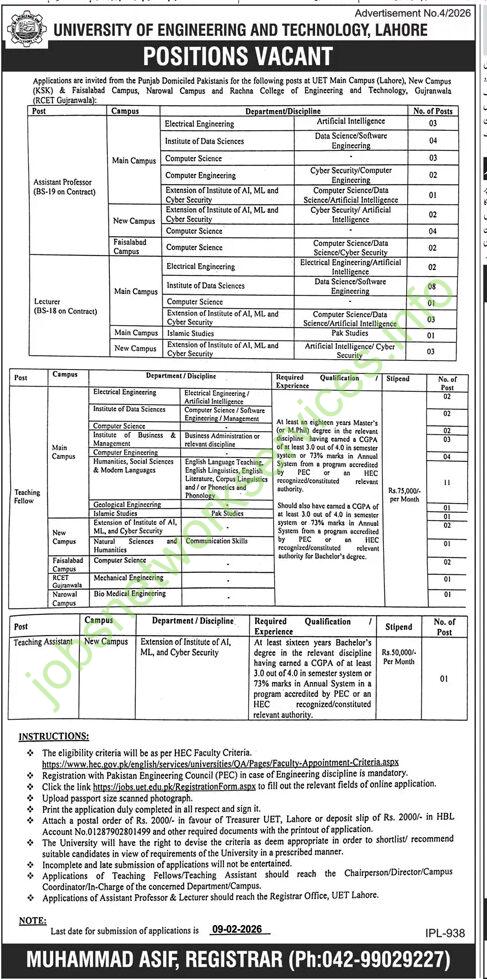 The University of Engineering and Technology (UET), Lahore, invites applications from Punjab-domiciled Pakistani nationals for various faculty positions across its campuses.