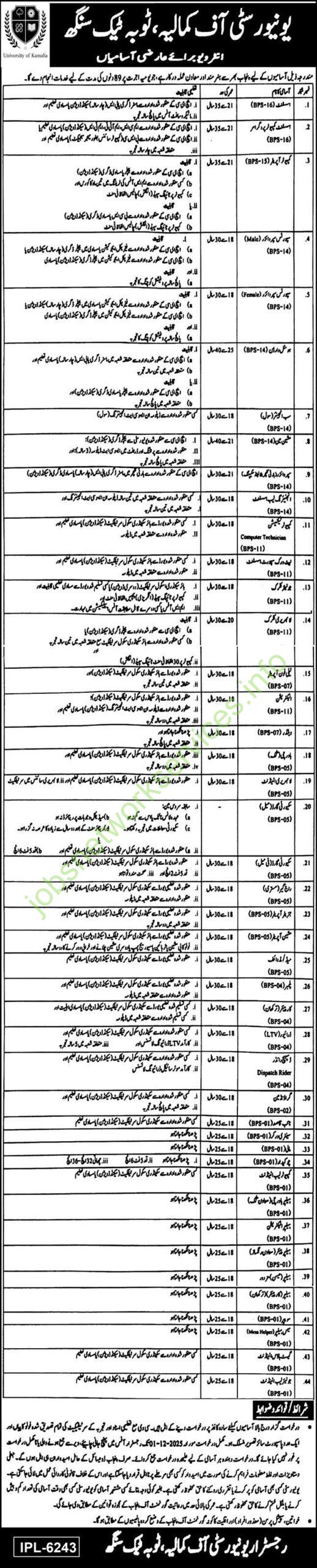 - Applications are invited for the following temporary posts in the University of Kamalia, Toba Tek Singh on a contract basis.