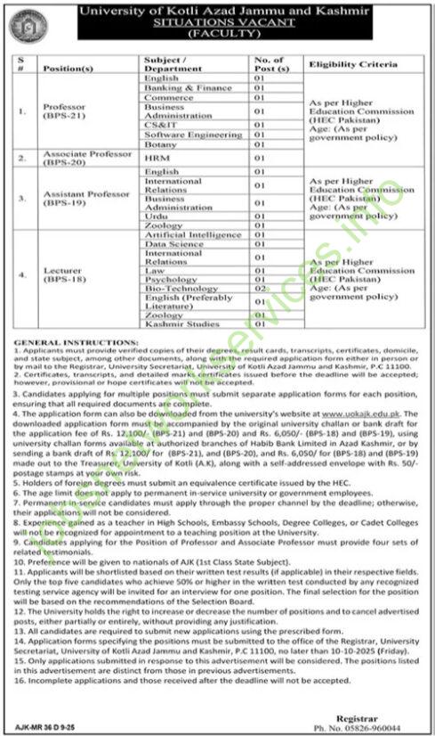 Job advertisement from the University of Kotli, Azad Jammu and Kashmir.