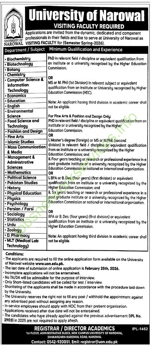 The University of Narowal is inviting applications from dynamic, dedicated, and competent professionals to serve as Visiting Faculty for the Semester Spring-2026.