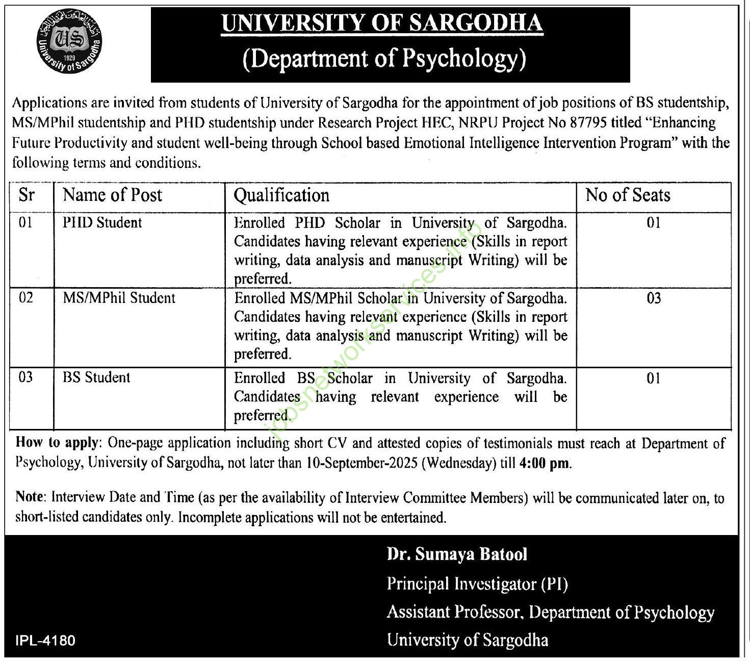 BS Studentship | 1 | Enrolled BS Scholar at University of Sargodha | Relevant experience |