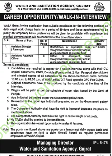 Interview Date: The advertisement lists 27.11.2005, which appears to be a significant typographical error. Given the context is for jobs in “2025,” the intended date is likely 27th November 2025. Candidates should verify this with WASA Gujrat.