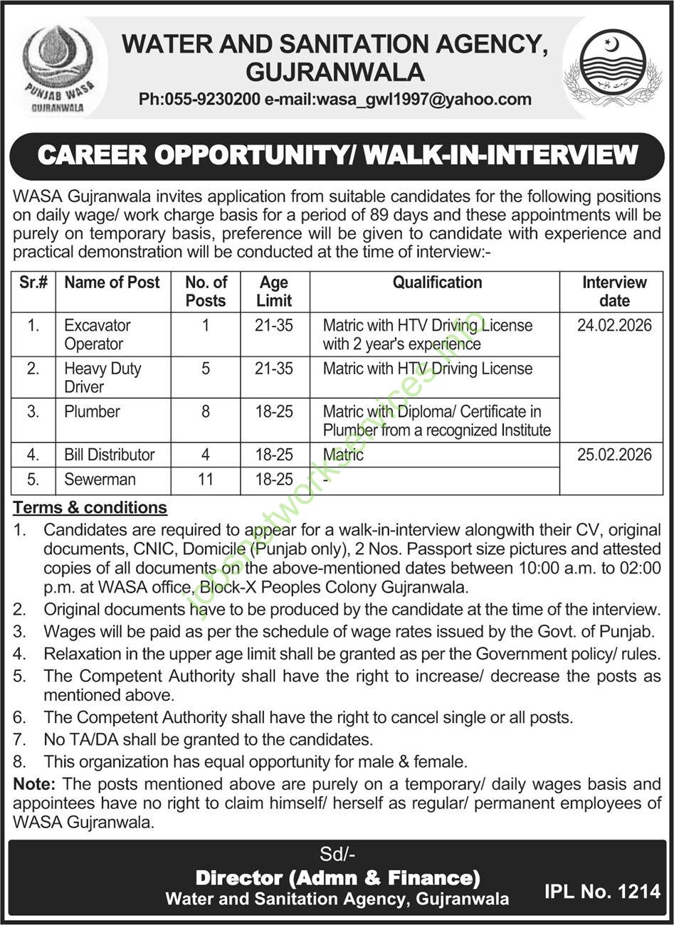 WASA Gujranwala invites applications from suitable candidates for the following positions on a daily wage/work charge basis for a period of 89 days. These appointments are purely temporary. Preference will be given to candidates with experience, and a practical demonstration will be conducted at the time of interview.