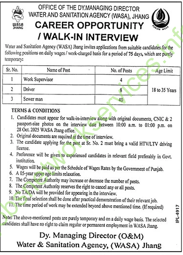 Eligible and interested candidates should appear for a walk-in interview on October 28, 2025, at the WASA Jhang office with all the required documents.