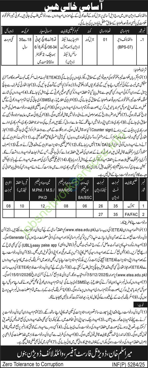 Applications are invited from suitable candidates for recruitment under the General Quota for the following posts in the Wildlife Division Bannu. Recruitment will be on a permanent basis according to the policy, rules, and regulations of the Khyber Pakhtunkhwa government.