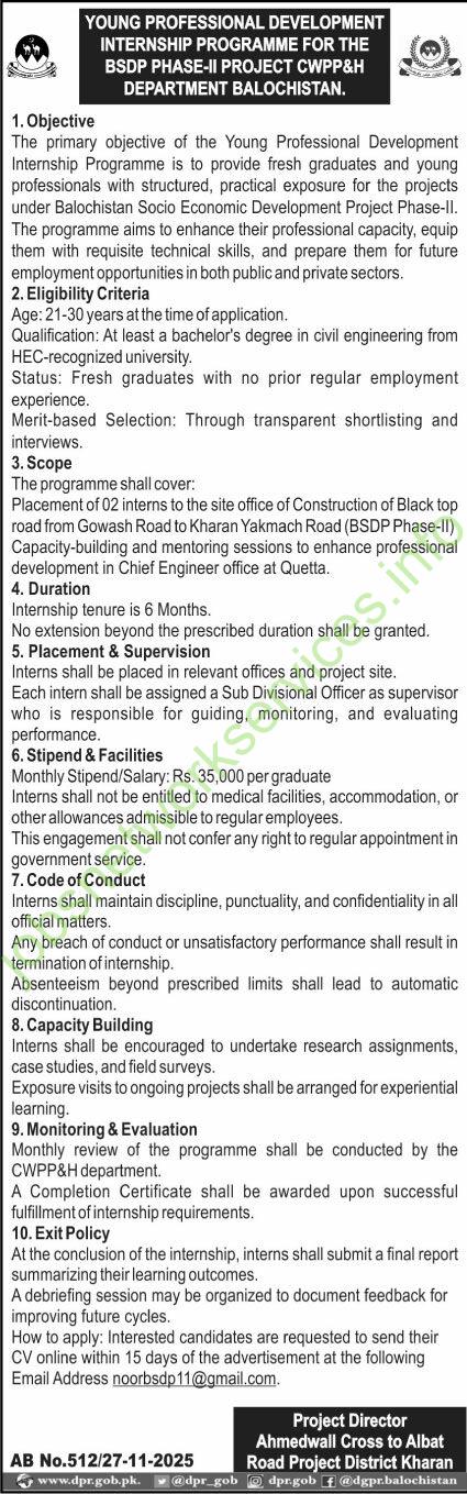 This is an internship opportunity for fresh civil engineering graduates within the Balochistan Socio Economic Development Project Phase-II (BSDP Phase-II), specifically under the CWPP&H Department.