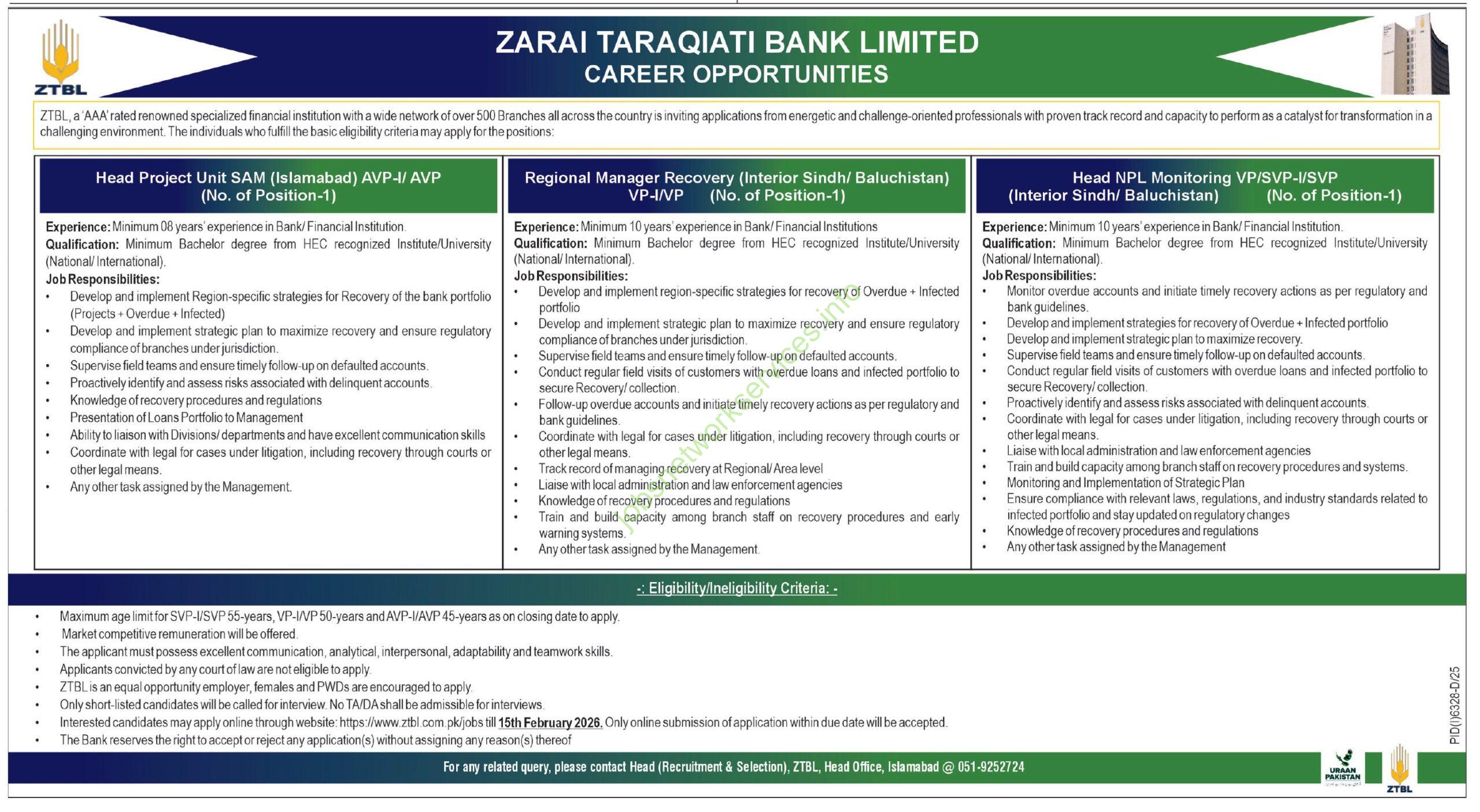 - Queries: Contact Head (Recruitment & Selection), ZTBL, Head Office, Islamabad @ 051-9252724