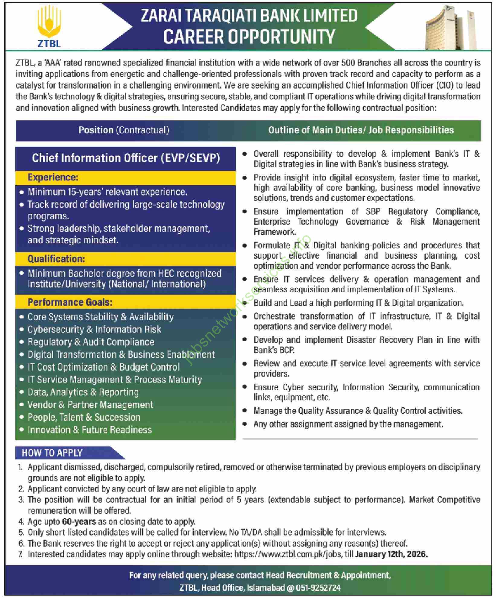 ZTBL is seeking a highly experienced and dynamic Chief Information Officer on a contractual basis to lead its digital transformation and manage all aspects of technology, security, and innovation. The role demands a strategic leader with at least 15 years of experience. Applications are submitted online with a deadline in early 2026.